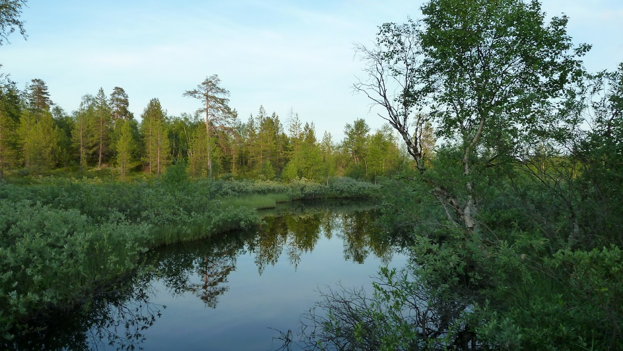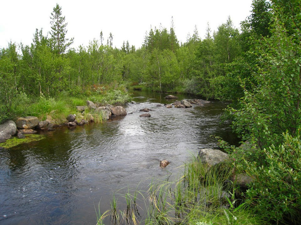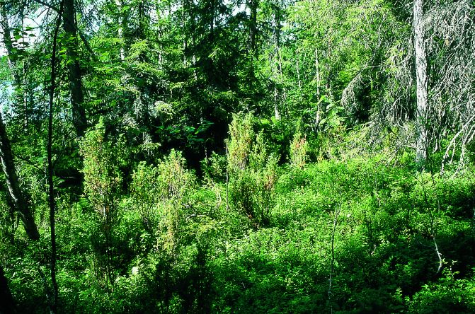 Non-water-logged northern boreal spruce forest with a low canopy closure (40-60 %) and low stand quality (IV-V). The proportion of birch in the tree layer is 20-30 %. The mapping unit is characterised by a range of boreal species that occur in more southern areas only in water-logged forests and in oligotrophic mires. The moss layer is well developed. In the northern part of the unit, pine forests with dominating shrub lichens occur (Cladina arbuscula, Cladina rangiferina, Cladina stellaris). Lichen pine forests are associated with the driest and most stony-rocky sites.