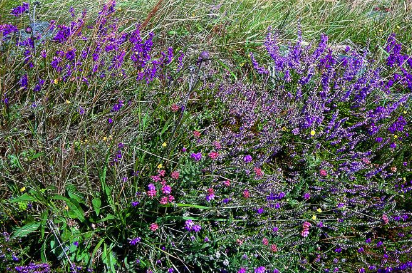 Calluna vulgaris (heather), Erica cinerea (heather), Festuca ovina (bottle_sedge), Festuca rubra (bottle_sedge), Plantago maritima (common_meadow_grass), Plantago lanceolata, Scilla verna (ABSENT), Lotus corniculatus (birdsfoot_trefoil), Thymus praecox (cross_leaved_heath), Potentilla erecta (birdsfoot_trefoil), Holcus lanatus (purple_moor_grass), Hypochaeris radicata (dandelion), Armeria maritima (red_clover_flowers), Viola riviniana (ABSENT), Carex flacca (bottle_sedge), Danthonia decumbens (small_fescue), Anthoxanthum odoratum (timothy_grass), Sanguisorba minor (red_clover_flowers), Anthyllis vulneraria (rock_rose)