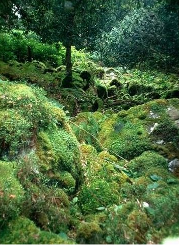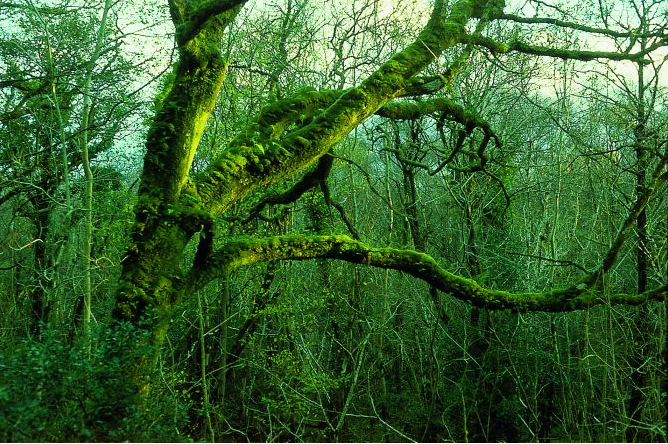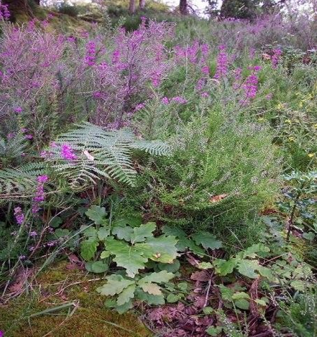 Quercus petraea dominates in the 15-20 m high tree layer, and there is scattered Betula pubescens. The well-developed shrub layer consists of Ilex aquifolium, Sorbus aucuparia and the naturalized Rhododendron ponticum (often thicket forming). In the herb layer dwarf shrubs such as Vaccinium myrtillus and Calluna vulgaris as well as Pteridium aquilinum are characteristic. They form a mosaic with grasses, herbs and other ferns. Opulent and species-rich moss layer with remarkable mosses, liverworts, lichens as well as epiphytic communities.