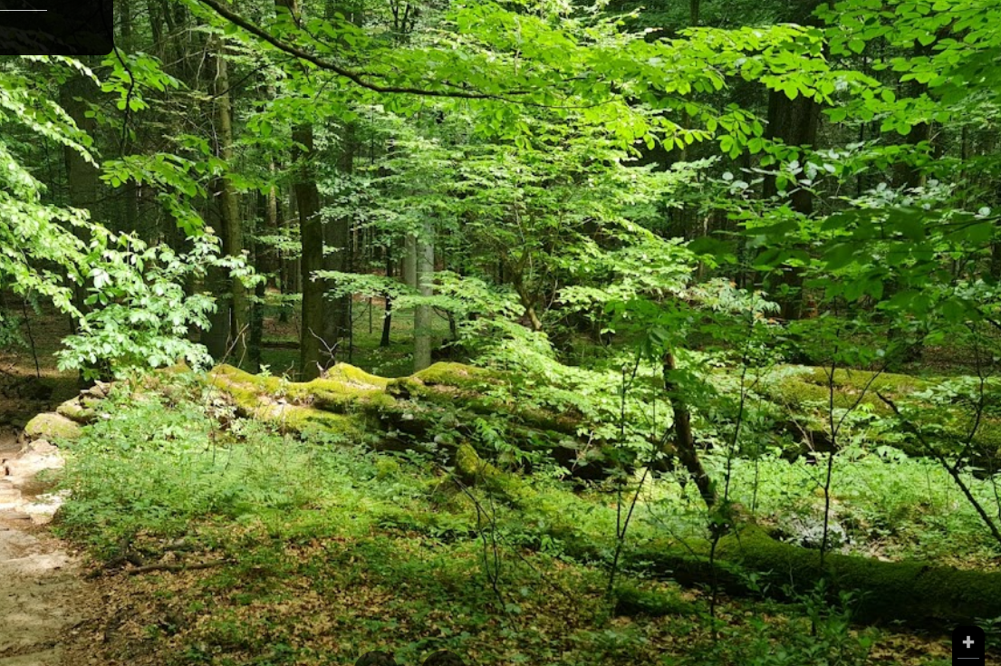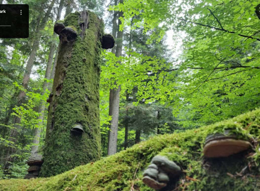 Common Beech dominating (purple), admixed Silver Fir (grey), Hornbeam (orange), Sessile Oak (lime green), Common Oak (dark green), isolated Norway Spruce (pink), Field Maple (brown)
