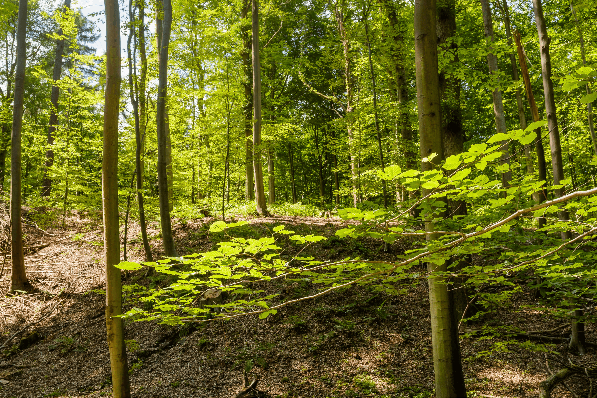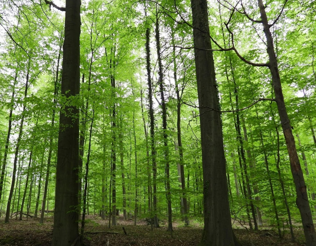 Fagus sylvatica dominating (Common Beech), admixed Quercus petraea (Sessile Oak), Quercus robur (Common Oak), comparatively rarely Betula pendula (Silver Birch), Populus tremula (European Aspen)