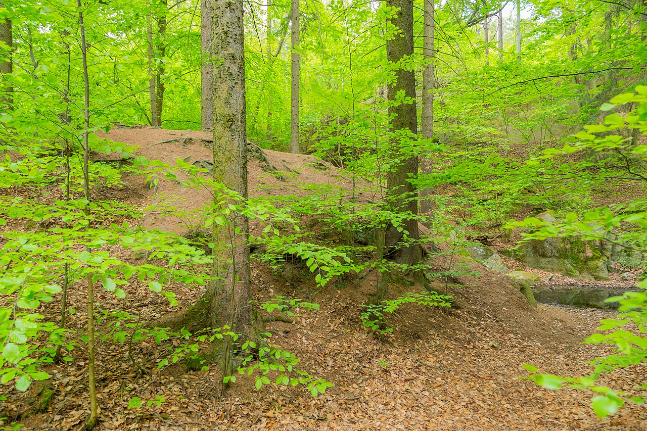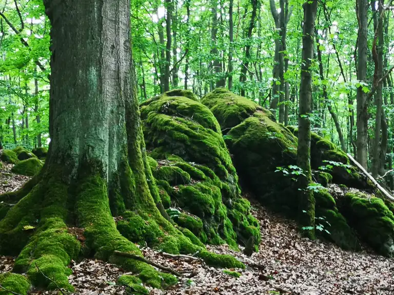 In addition to the dominant beech, moderately growing oaks are always scattered in the largely monolayered forests, particularly Quercus petraea, and in fresh-moist forms also Quercus robur, while there is also a varying participation of fir. The growth of the trees is moderate to good. The shrub layer is usually only sparsely developed, consisting primarily of beech upgrowths; the herb layer is also species deficient with a small degree of coverage.