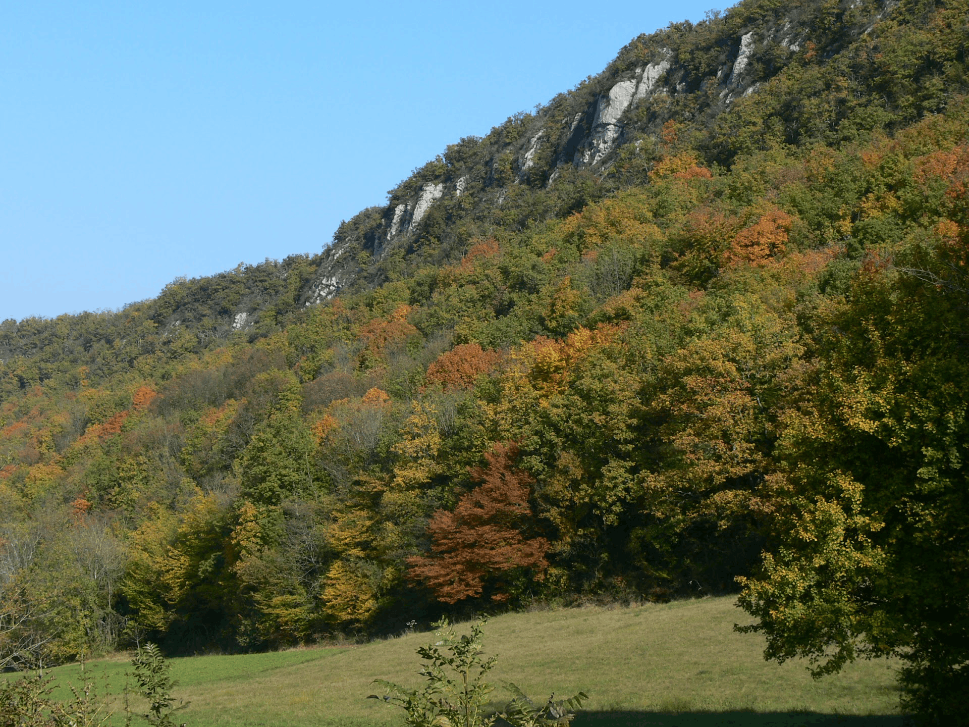 predominantly Quercus pubescens (Downy Oak), admixed Quercus petraea (Sessile Oak), (Quercus robur (Common Oak)); Sorbus torminalis (Wild Service Tree), Sorbus domestica (Wild Service Tree), Sorbus aria (Whitebeam), Ulmus minor (English Elm), Prunus avium (Linden), Prunus cerasus, Acer campestre (Field Maple), Acer opalus (Field Maple (tiny-medium), Tilia cordata (Linden), Tilia platyphyllos (Linden), (Fagus sylvatica (Beech), Pinus sylvestris (Scots Pine))