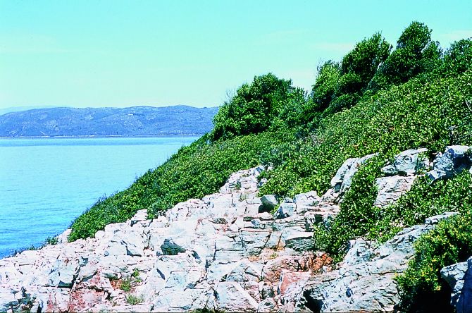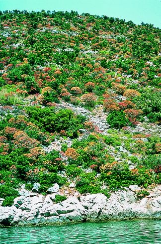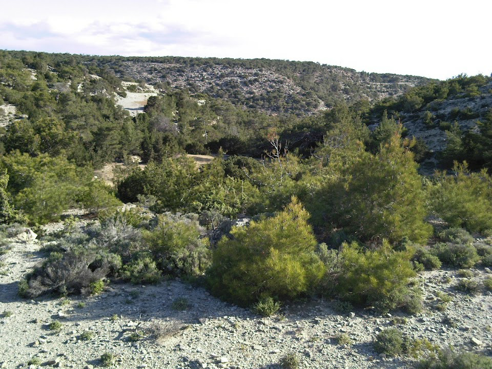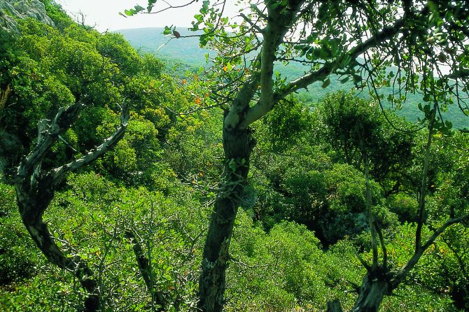 Quercus coccifera (Kermes Oak), Pistacia lentiscus (Mastic Tree), Olea oleaster (Olive Bush), Ceratonia siliqua (Carob); Pinus brutia (Maritime Pine) and Pinus halepensis (Maritime Pine (small)) locally