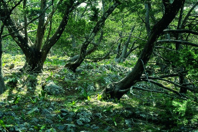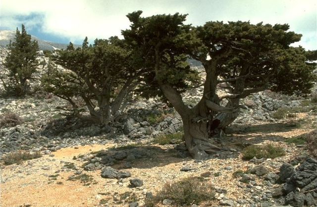 Open montane coniferous forest consisting of horizontal cypresses (Cupressus sempervirens) with admixtures of Quercus coccifera and Acer sempervirens, in basins and at lower slopes there is also Zelkova abelicea locally. The shrub layer is varyingly developed depending on light conditions and features Berberis cretica and Crataegus monogyna. Neighbouring oro-Mediterranean thorn-cushion vegetation spills over non-specifically in the herb layer; Luzula nodulosa is more shade tolerant.