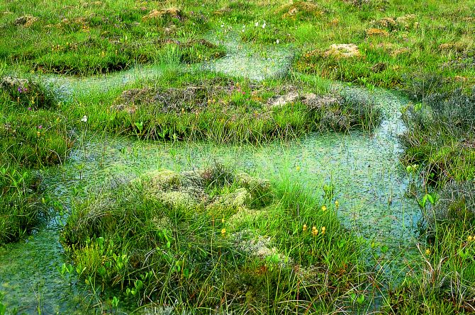 S8b bog hollows: Eriophorum angustifolium, Rhynchospora alba (rushes), Carex limosa (rushes), Scheuchzeria palustris (rushes), Menyanthes trifoliata, Carex pauciflora (sedge)